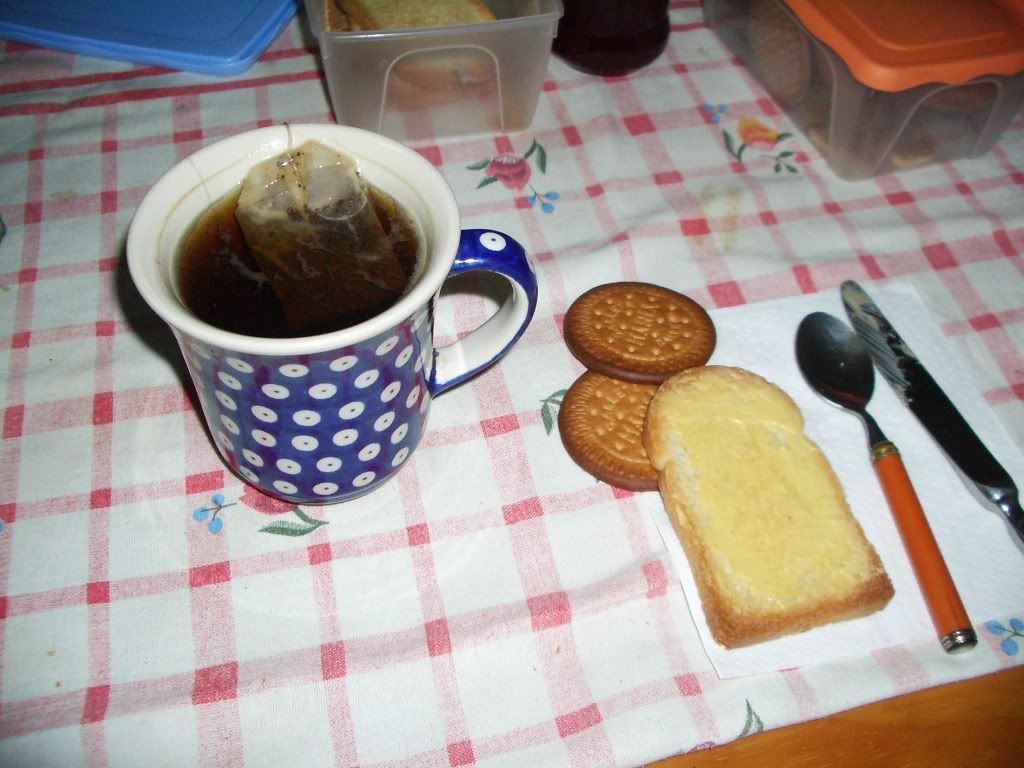 The morning started off with a wakeup at 7:30 AM, as usual! I get up and take a quick shower, and get ready for the day- about 8:15, I eat breakfast of some tea, toasted bread, and some cookies. This is what my everyday breakfast looks like: