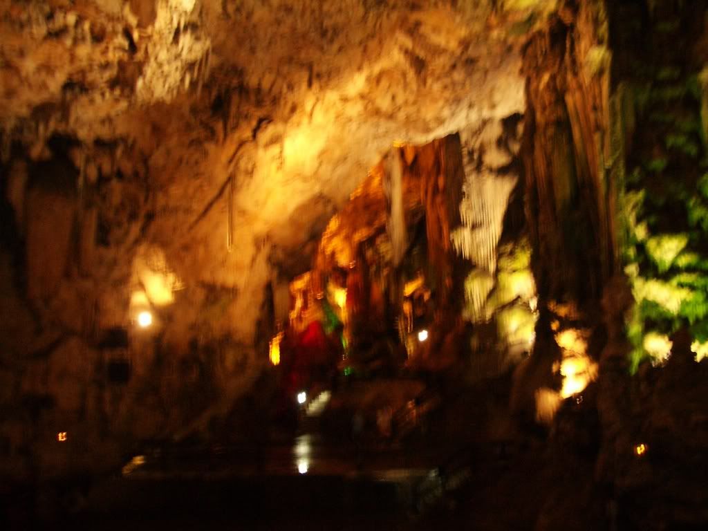 It was HUGE! Hundreds of hundreds of Stal... Stalaga...Stalactites! hung down from the ceiling, a work of Nature for thousands of years. A recording of a violin played in the background of the cave, and illuminated lights made the entire area literally come to life. It was hard to take all of it in at the first glance... every which way you`d look would be another form of natural art. It was so insane!